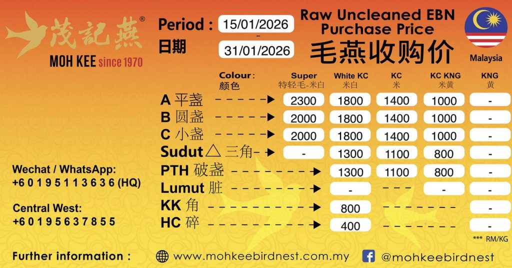 我们将在每月1日及15日,根据燕窝市场价格波动,更新毛燕收购价。谢谢!敬请关注